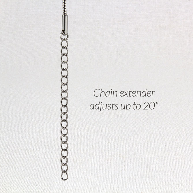 Pendulum Lockets are stainless steel and come packaged in a gift box with an adjustable 20″ stainless-steel chain, three red felt pads, an instruction card, and a wooden skewer to help with removing and inserting the felt pads.