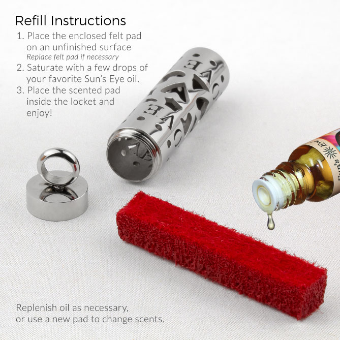 Each locket comes in a gift box with an adjustable 20″ stainless steel chain, 3 red felt pads to saturate with oil, and an instruction card.