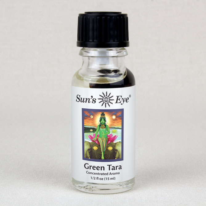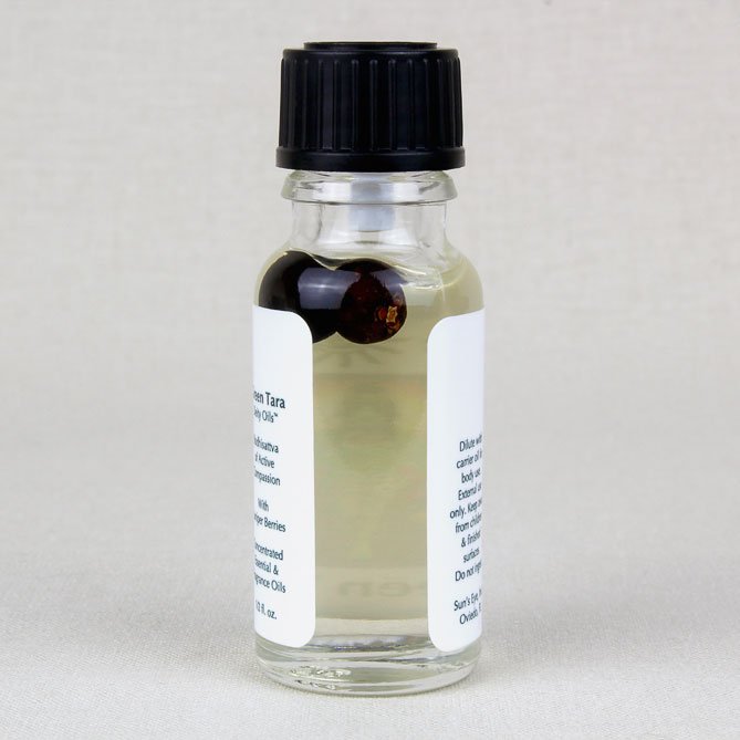 Green Tara Oil, featuring Juniper Berries with an exotic top note and a base note of Sandalwood, is formulated to encourage attributes of Green Tara: bodhisattva of active compassion. Traditionally associated herbs are included as the Deity Oils are blended to honor the energetic qualities of each of the Deities.